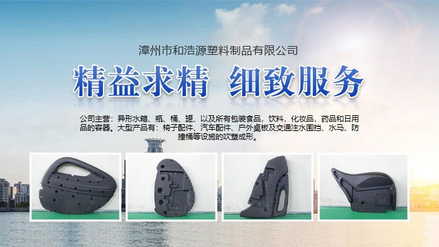 漳州市和浩源塑料制品有限公司是漳州塑料制品行業的知名企業,本公司擁有專業的團隊,從產品設計、模具開發到生產,并具有先進的生產設備,精湛的生產工藝,嚴格的管理,具備根據用戶需要進行設計、制造生產用戶所需產品的能力。 公司主營:異形水箱、瓶、桶、罐、以及所有包裝食品,飲料,化妝品,藥品和日用品的容器。大型產品有:椅子配件、汽車配件、戶外桌板及交通注水圍擋、水馬、防撞桶等設施的吹塑成形。 “誠實守信,互惠共贏”,是我們的經營理念;“精益求精,細致服務”,是我們的工作準則,“堅持行業標準,創造時代精品,追求優良的品質”,是我們的質量標準和目標;“以人為本,科技創新,簡捷嚴明,管理規范”是我們管理機制的核心內容;“生產優良產品,提供細致的服務”,是我們的承諾。